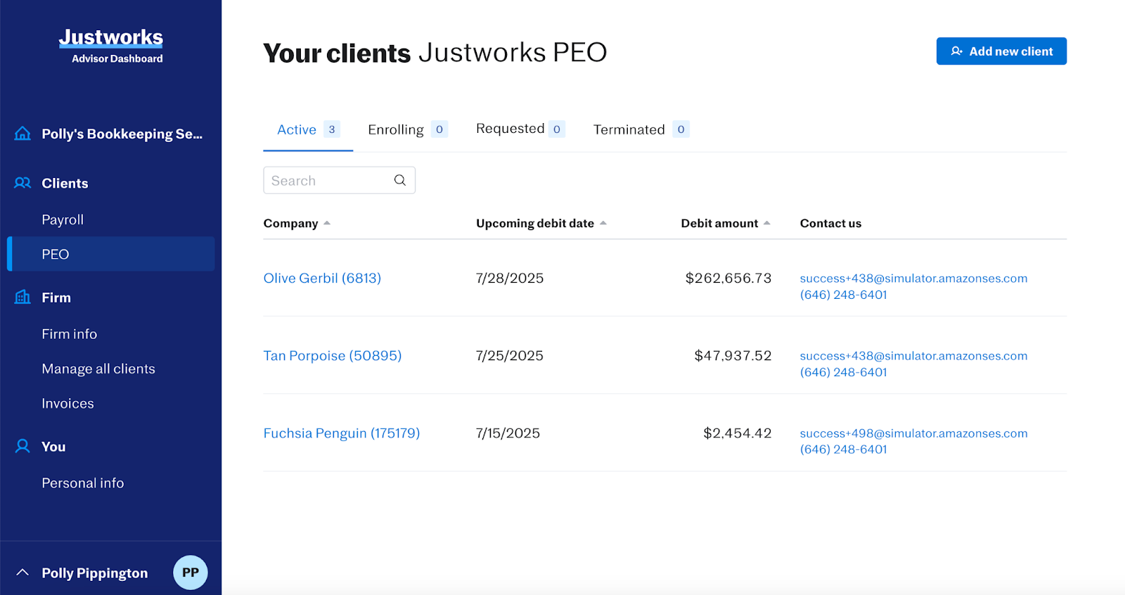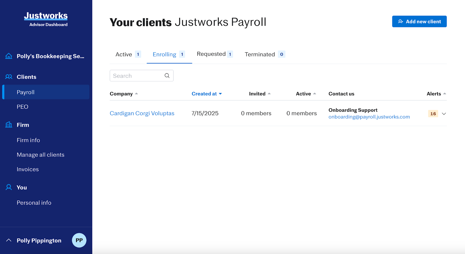 While the ‘Active’ tab shows any clients live on Justworks, the ‘Enrolling’ tab shows clients currently going through the onboarding process, and the ‘Terminated’ tab shows clients no longer using Justworks.