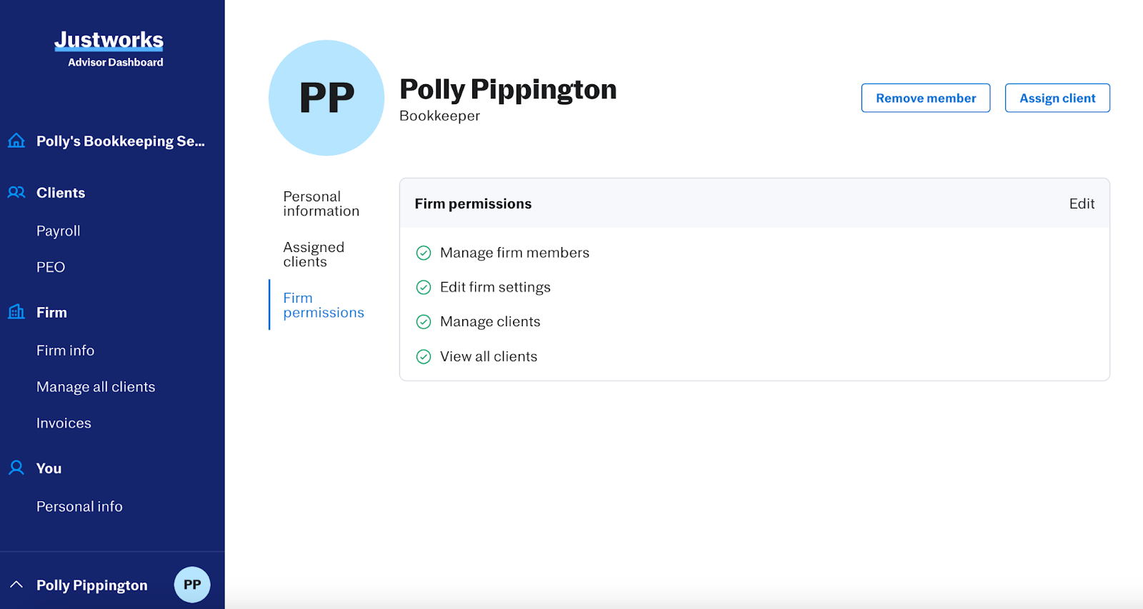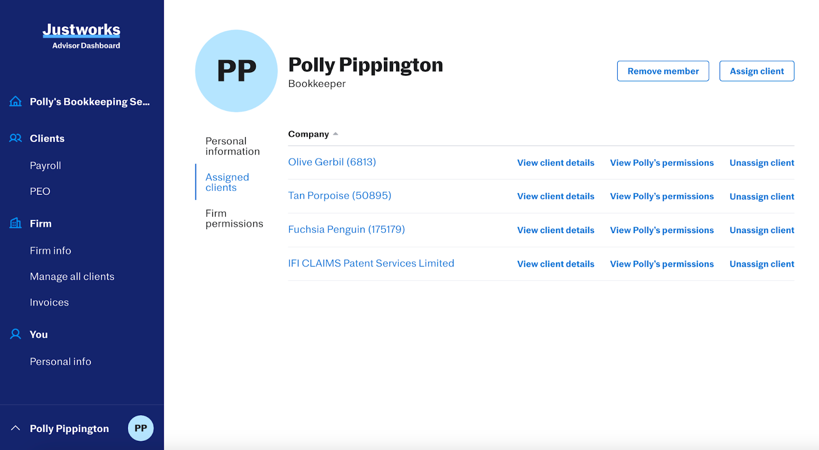 Removing a firm member from a client’s account is as simple as selecting the option to ‘Unassign client.’ This will fully remove the firm member’s access to that company within Justworks PEO or Justworks Payroll.