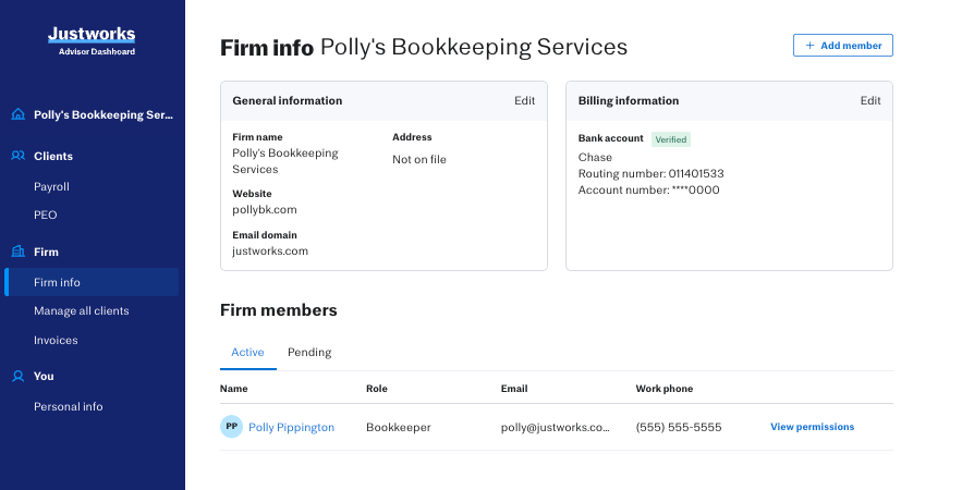 On this page, the firm’s current details on file can be viewed and edited as needed. If the firm’s email domain needs to be updated, you will need to reach out to our Support Team at advisor-support@justworks.com for security purposes — our team will be happy to assist you!