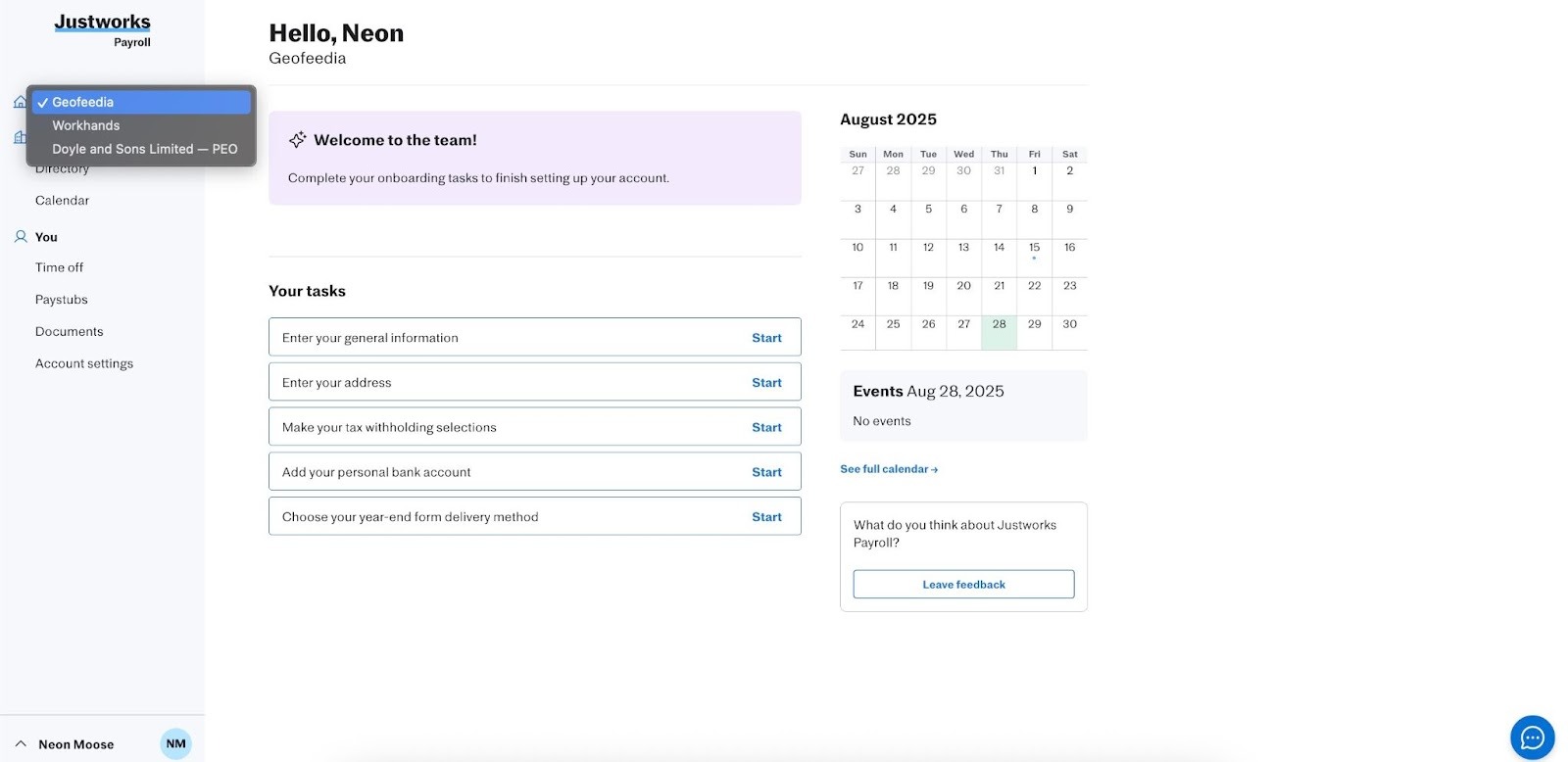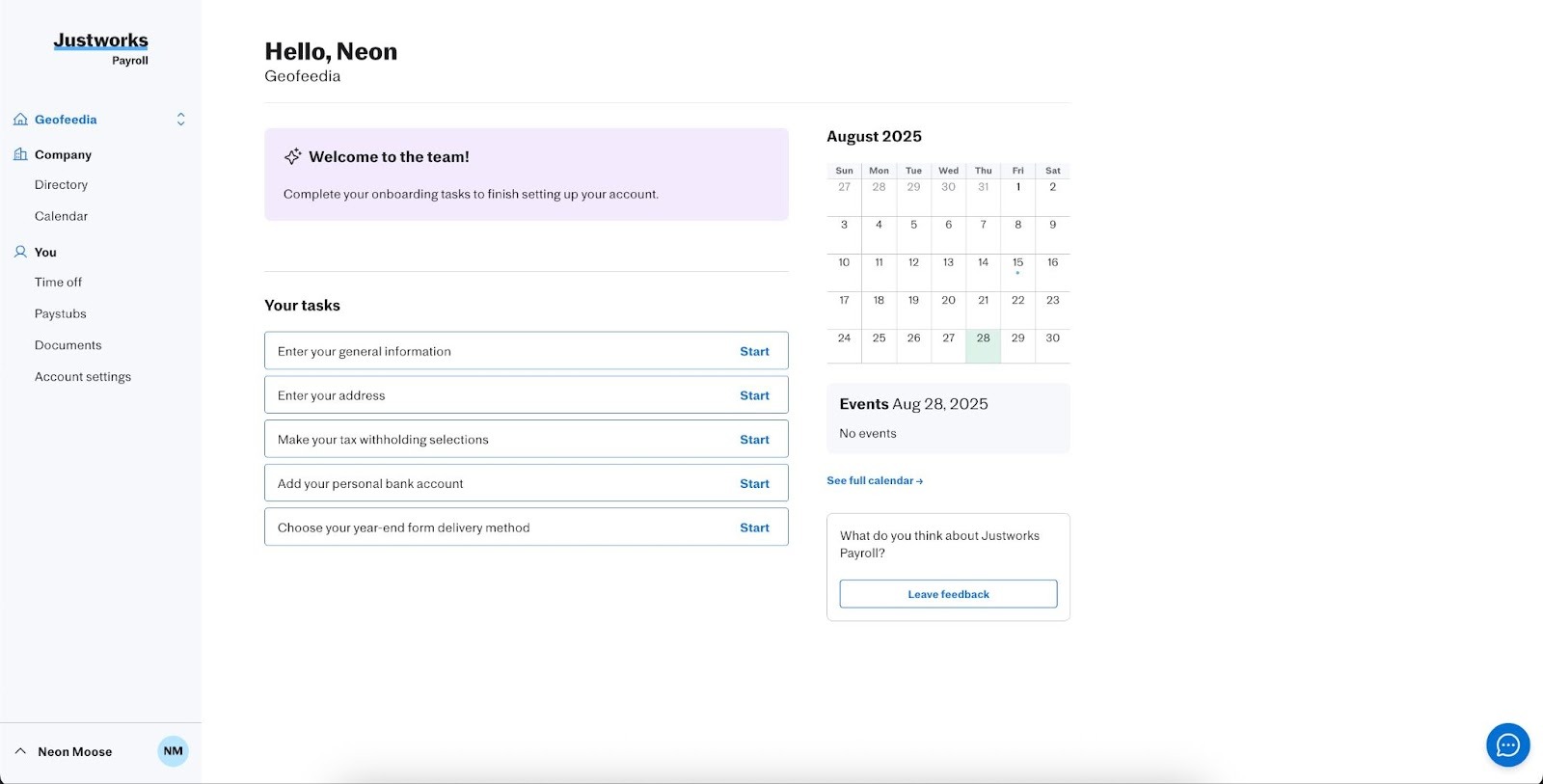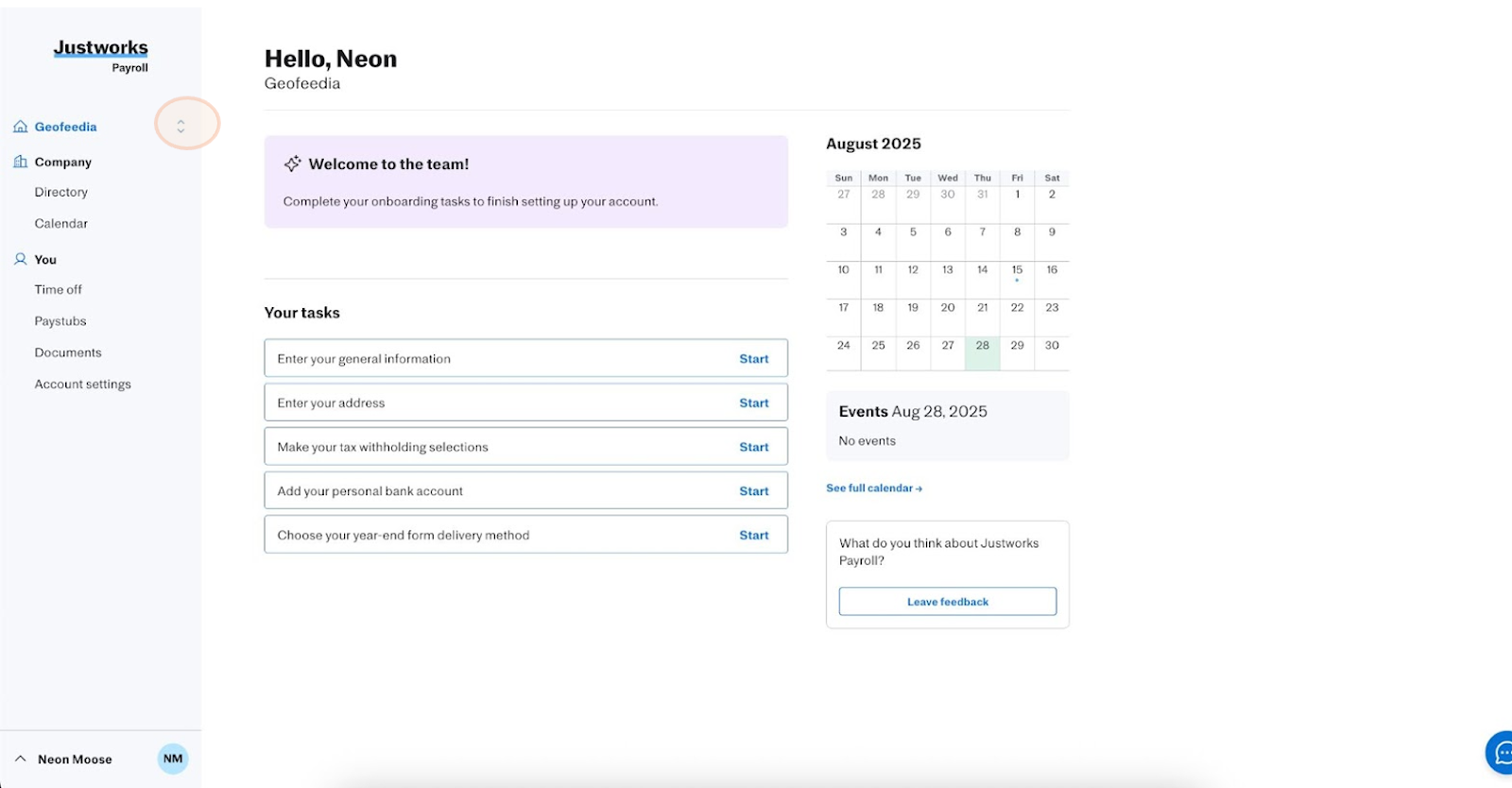 4. Access Your New Payroll Account: After logging in, you’ll be taken to the Justworks Payroll home screen for your new company.