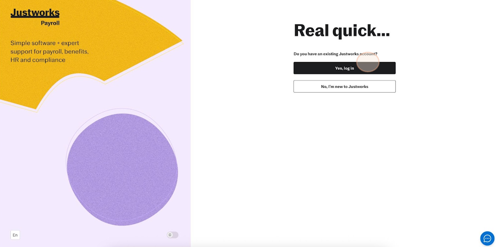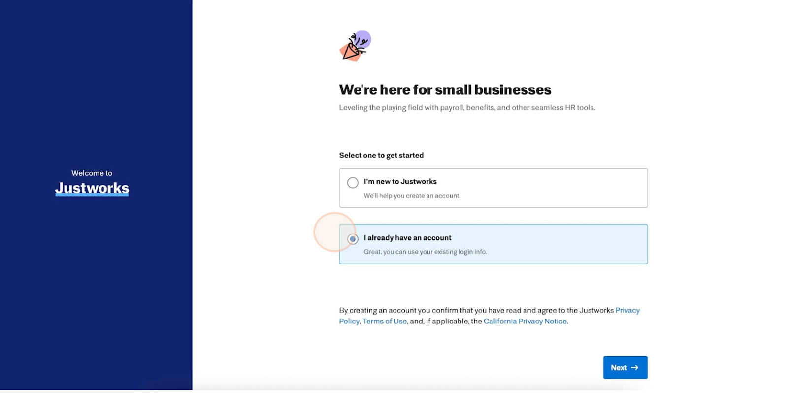 2. Confirm You Have a Justworks Account: You’ll see a message asking, “Do you have an existing Justworks account?” Select “Yes, log in."