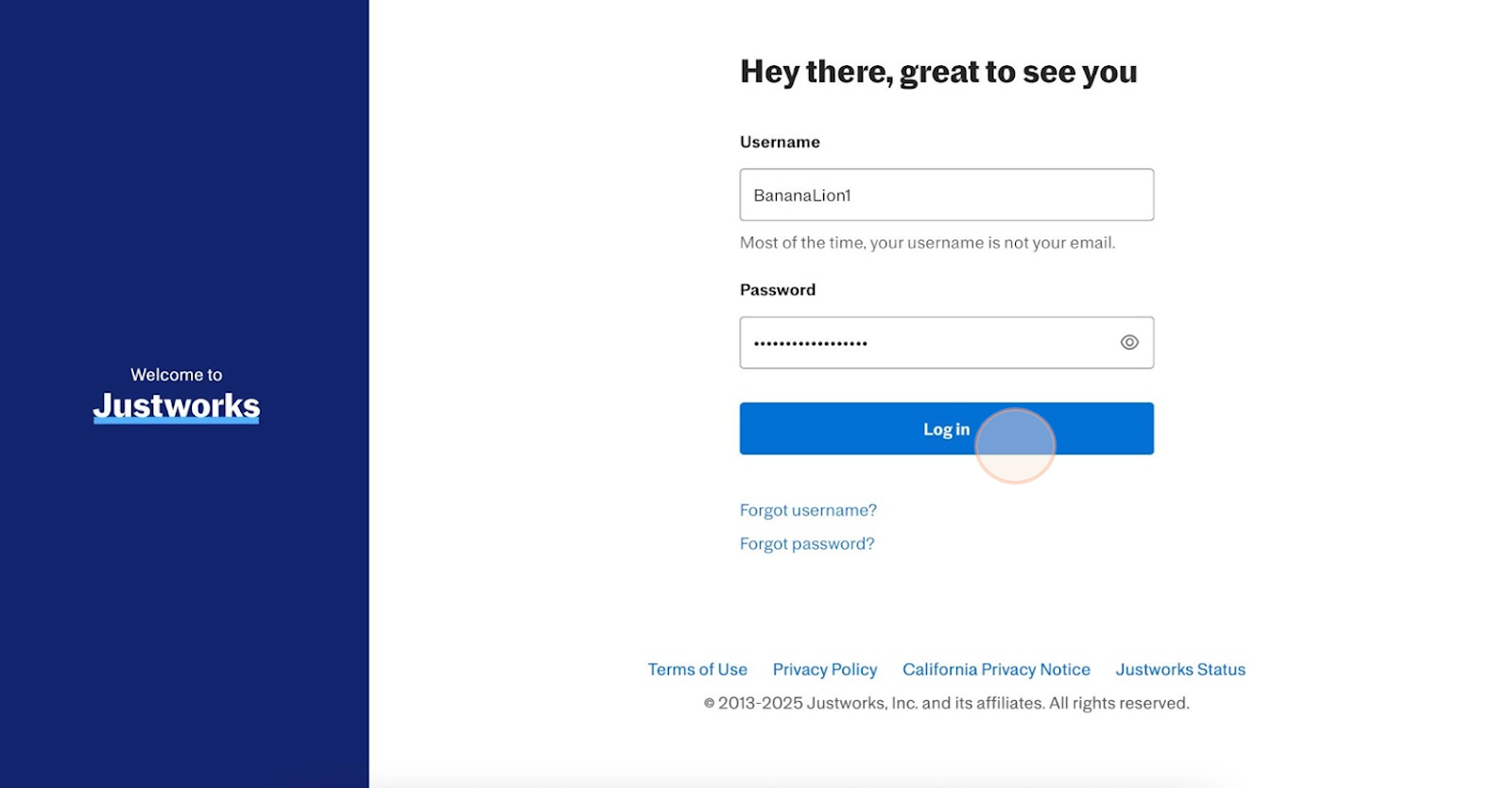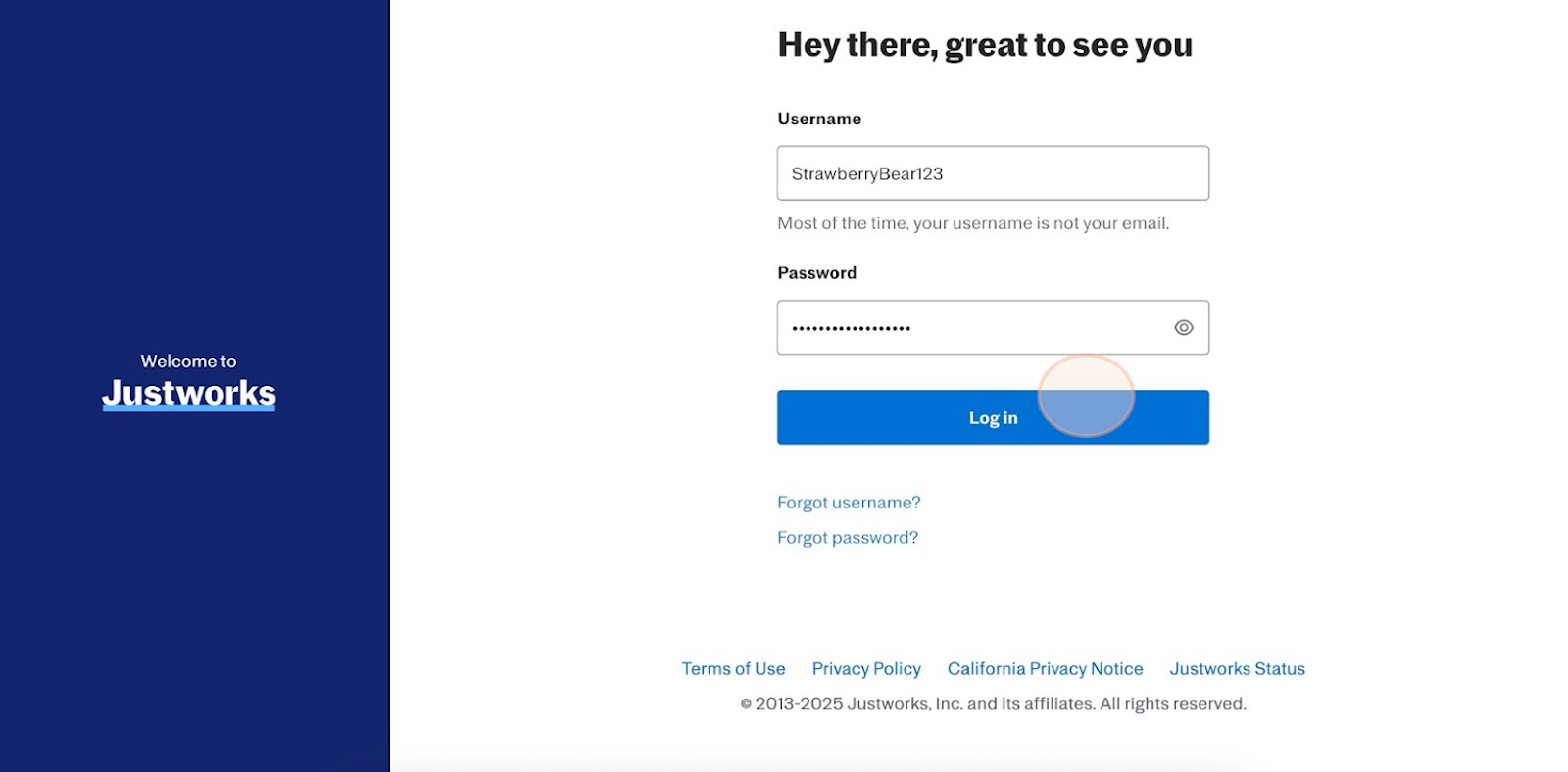3. Log In Using Your Current Credentials: You’ll be redirected to the login screen. Enter your existing Justworks credentials and select “Log In” to continue.