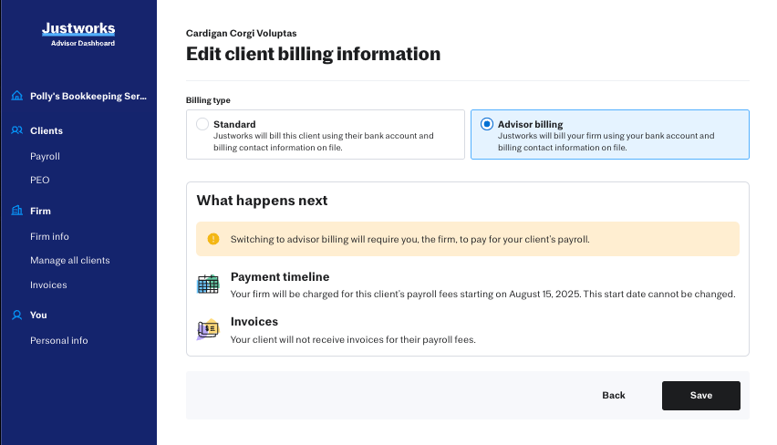 You can select how each of your clients is billed — either directly by Justworks or through your firm — for both new and existing clients.