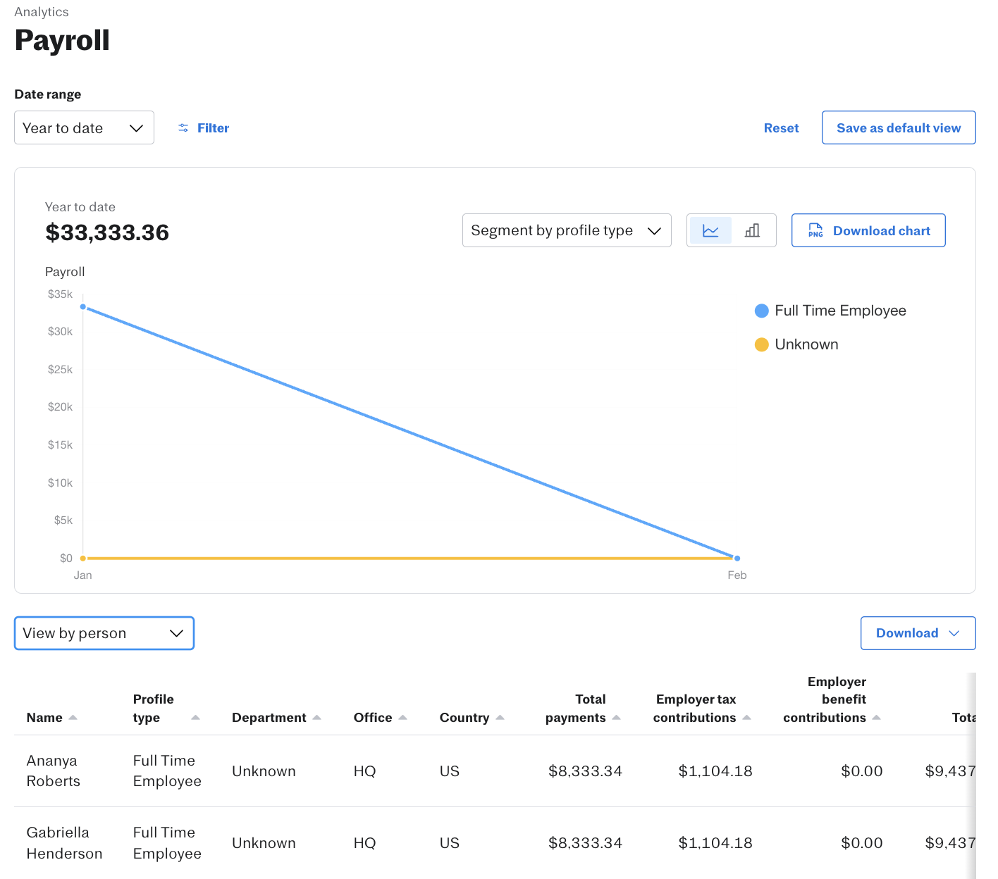 The Payroll page gives you a view into compensation and employer contributions trends across your organization, combining a visual summary with detailed payroll data below.