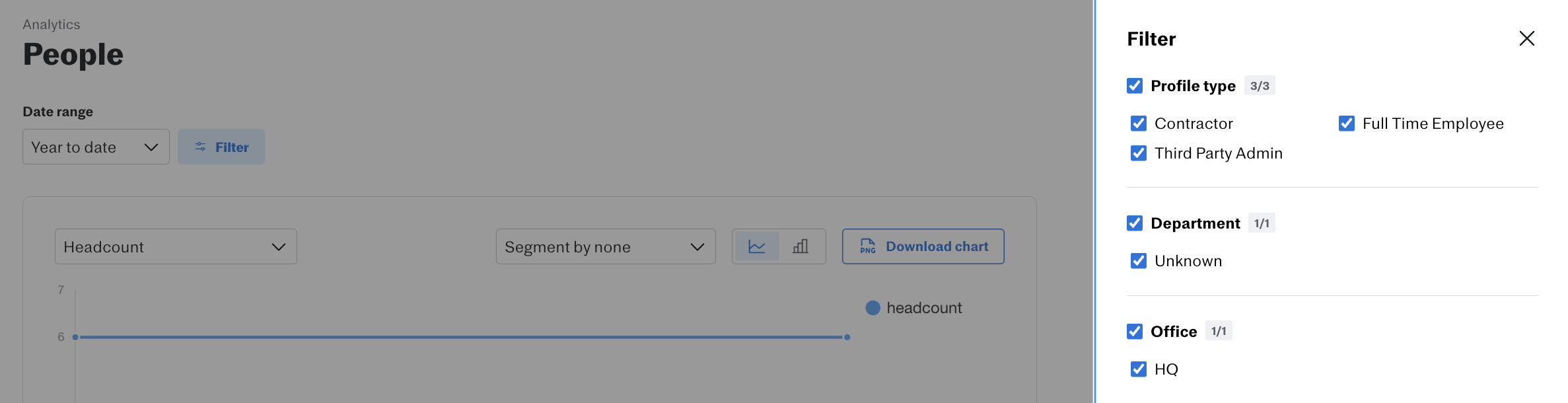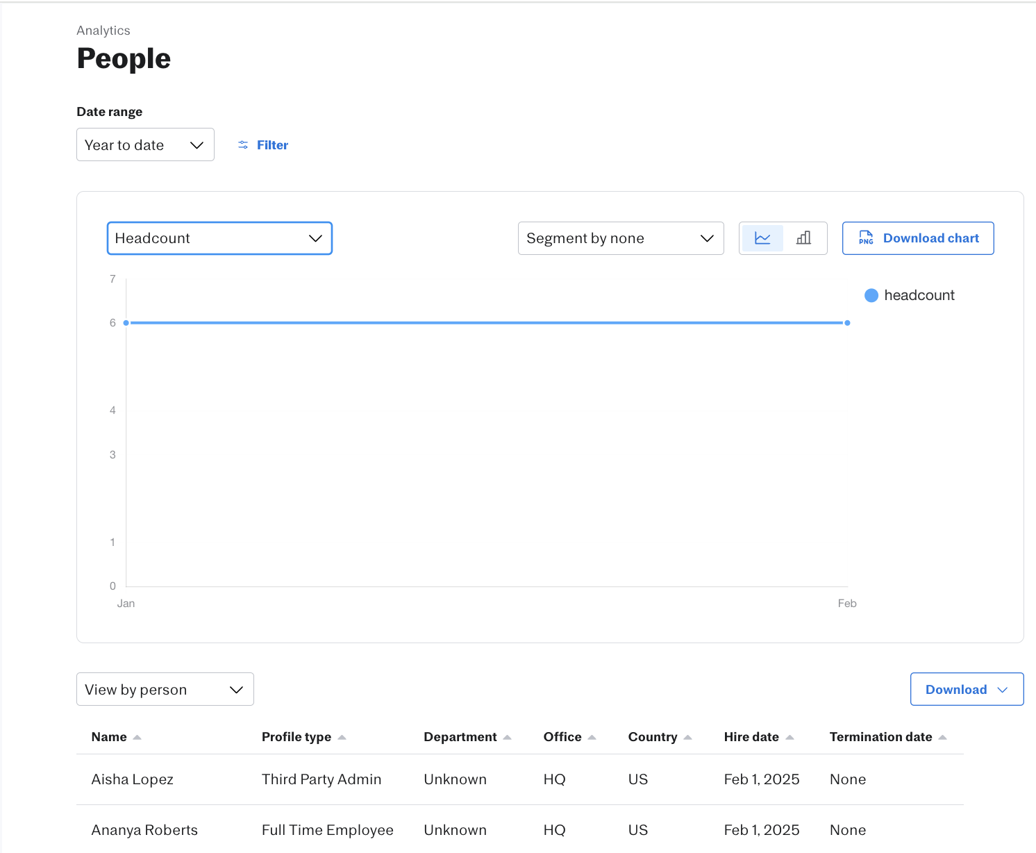 On the People page, the visualization lets you view headcount or new hires and terminations. You can customize the display by: