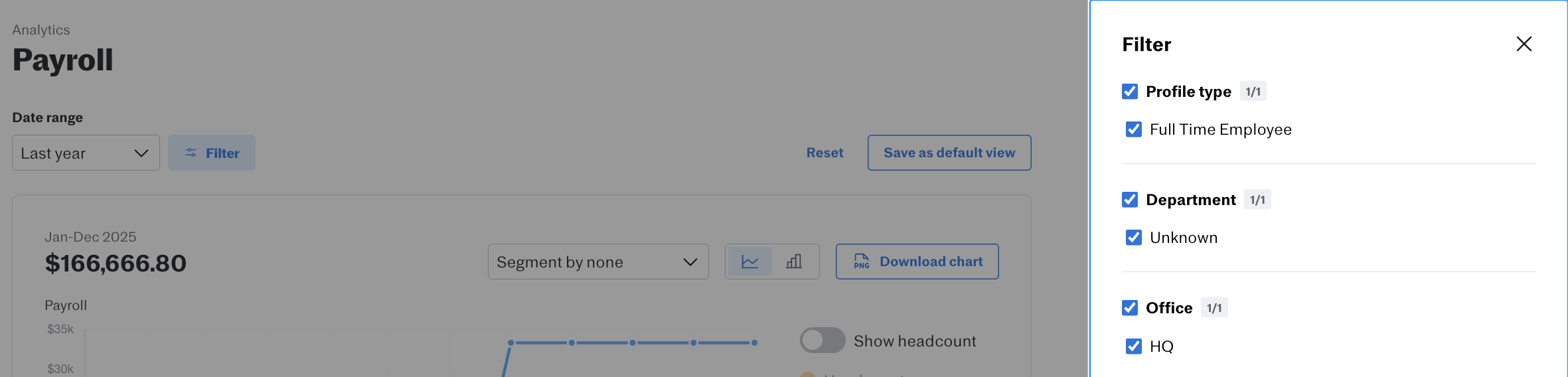 Each page keeps its own saved view, so you can tailor how Payroll and People insights appear when you revisit Analytics.
